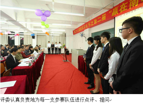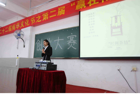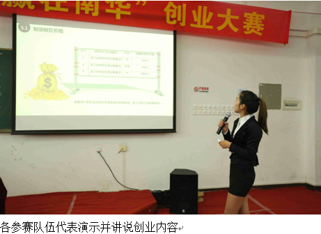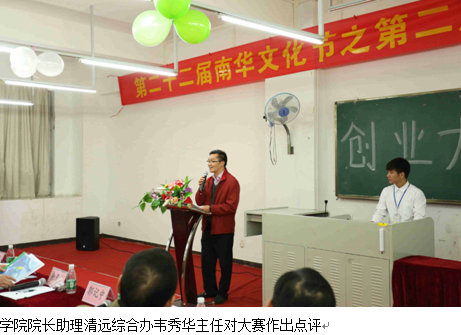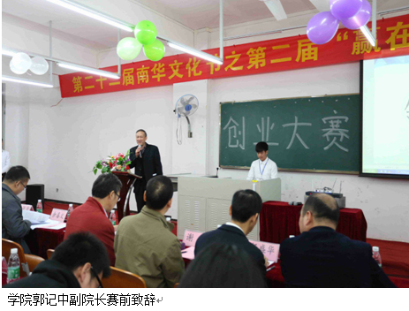 2015年12月8日晚7点,第二十二届南华文化节之第二届“赢在南华”创业大赛总决赛于在实验楼316隆重举行。莅临本次创业大赛的嘉宾评委有:学院郭记中副院长、学院院长助理清远校区综合办韦秀华主任、学院图书馆谢曼馆长,学院团委余喜文书记,学院招生办杨盛华副主任,学院教务处郑海清副处长,信息工程与商务管理学院李新院长、刘杰副院长、凌红副书记。出席本次大赛的还有各支队伍的指导老师、各二级学院团学代表以及信商各班学生代表。