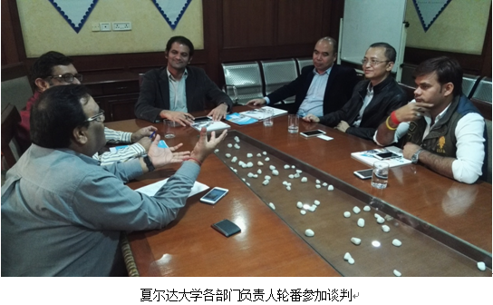 第一天飞抵印度首都新德里入住酒店已近晚上十二点(北京时间凌晨二点半),第二天一早便乘车前往新德里东南四十多公里的夏尔达大学考察交流。新德里污染严重,空气中弥漫着刺鼻的气味,道路上各种车辆拥挤不堪,但丝毫阻档不了国际访客的热情,与我们一同出现在校园里的还有日本考察团和德国考察团,这与在机场很少见到外国人形成反差。夏尔达大学是一所经印度政府大学资质认证委员会 (UCG)认可的私立大学,在校生两万多人,设有工程技术学院、商学院、牙科学院、医学研究学院、法学院、语言学院、综合科学及创意艺术学院等7个学院。由于印度IT世界闻名,我方重点与信息工程技术学院负责人及老师们进行了合作洽谈,校方非常重视与我们的合作,经过一整天多轮谈判,下午6点达成合作意向,双方签订合作意向书,最后该校的副校长Dr. Vijay Gupta接见了我方人员及德国的考察团。