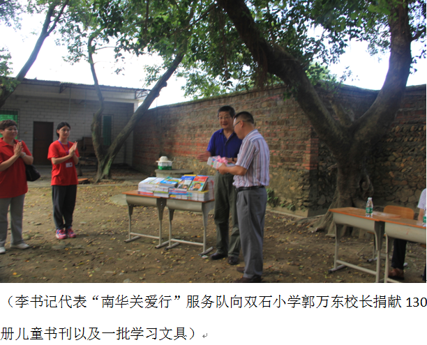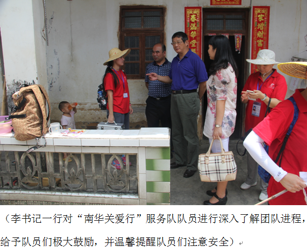 2015年7月19日,天高云淡,学院党委李河川书记带队,与信息工程与商务管理学院李新院长、信息工程与商务管理学院党总支凌洪副书记一行,前往韶关市翁源县新江镇,慰问正如火如荼地开展三下乡活动的“南华关爱行”服务团队!与队员走村串巷去到留守儿童以及孤寡老人家中调研慰问,并受到当地新闻电视台的采访!同时对“南华关爱行”团队调研慰问结合送健康入户模式十分称赞,表示大学生就应该要学以致用,乐于奉献!