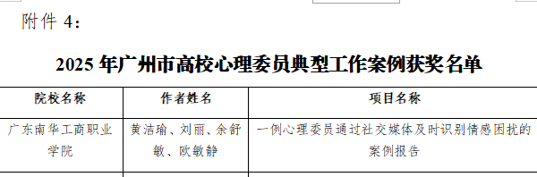 黄洁瑜老师团队提交的《一例心理委员通过社交媒体及时识别情感困扰的案例报告》入选“广州市高校心理委员典型工作案例”,体现了我院在心理健康教育工作中的创新探索与实践成效,为心理育人提供了可借鉴的经验。