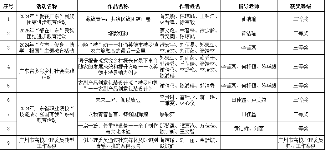 在2024年广东省职业院校“技能成才强国有我”系列教育活动中,黄洁瑜老师团队指导的非遗文化传承作品《一扇一鸢,传承非遗情——亲手制作与文化体验》荣获二等奖,展现了传统技艺与现代教育的深度融合。田佳鑫老师团队指导的学生作品《未来工匠,阅以致远》和《以我青春誓言,铸强国辉煌》均获三等奖,彰显了学院学子立志报国的青春誓言。
