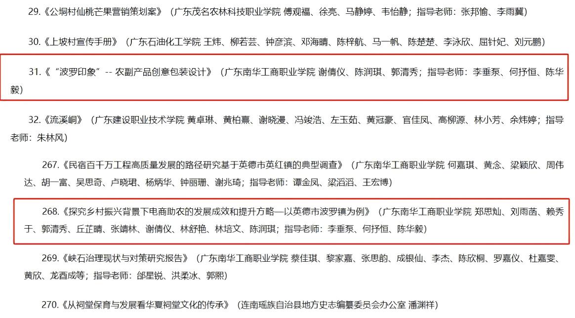 李垂泵老师团队深耕乡村振兴一线,带领学生积极开展社会实践与调研活动。在2024年“立志·修身·博学·报国”主题教育活动中,纪实类作品《心随“波”动——打通英德市波罗镇农文旅融合的最后一公里》荣获三等奖。此外,在广东省多彩乡村社会实践活动中,调研报告《探究乡村振兴背景下电商助农的发展成效和提升方略—以英德市波罗镇为例》、农副产品创意包装设计《“波罗印象”-- 农副产品创意包装设计》均获三等奖,体现了学院师生服务乡村发展的责任担当和专业素养,为乡村振兴事业添砖加瓦。