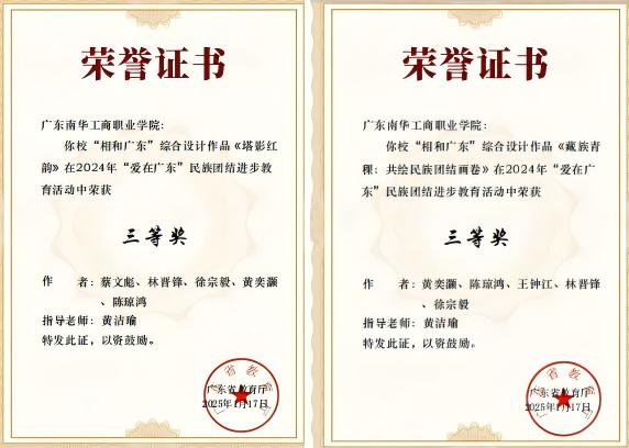 在2024年“爱在广东”民族团结进步教育活动中,黄洁瑜老师指导的两组学生作品双双荣获三等奖。其中,《藏族青稞:共绘民族团结画卷》以艺术设计展现民族团结的生动图景,而《塔影红韵》则通过文化创意传递民族交融的深厚情谊,充分体现了我院学子在弘扬民族文化、促进民族团结方面的创新实践。