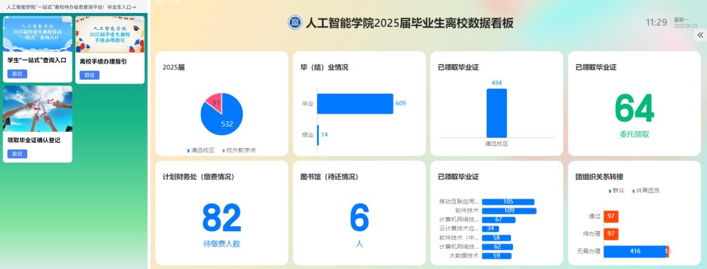 人工智能学院坚持以学生为中心的工作理念,充分利用信息技术手段,在毕业生离校工作中推出“一站式”数字化离校事项服务平台,包含了离校服务指引、计划财务处、图书馆、党团组织关系转接、领取毕业证等多个环节,让学生一站式查询离校待办事项,学生对待办事项一目了然,实现多数据联动,辅导员精准掌握学生领取毕业证进展。这是学院继2024级数字化迎新的又一举措。