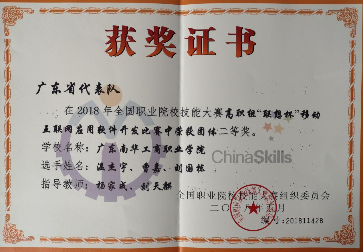 5月22日,我校学生团队在2018年全国职业院校技能大赛“移动互联网应用软件开发”赛项获团体二等奖。该团队由信息工程与商务管理学院温杰宇、曹嘉、刘国栋三名同学组成,杨家成、刘天麒担任指导老师。