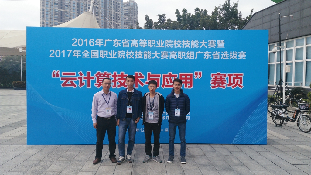 12月3日-4日,由广东省教育厅主办的2016年广东高职院校技能大赛暨全国职业院校技能大赛选拔赛“云计算技术与应用”赛项在深圳职业技术学院举行。经过4个小时激烈比赛,我院14级计算机网络技术专业李科宏、陈培龙和14级计算机信息管理(移动应用开发工程师)专业李海冰组建的代表队获得三等奖。