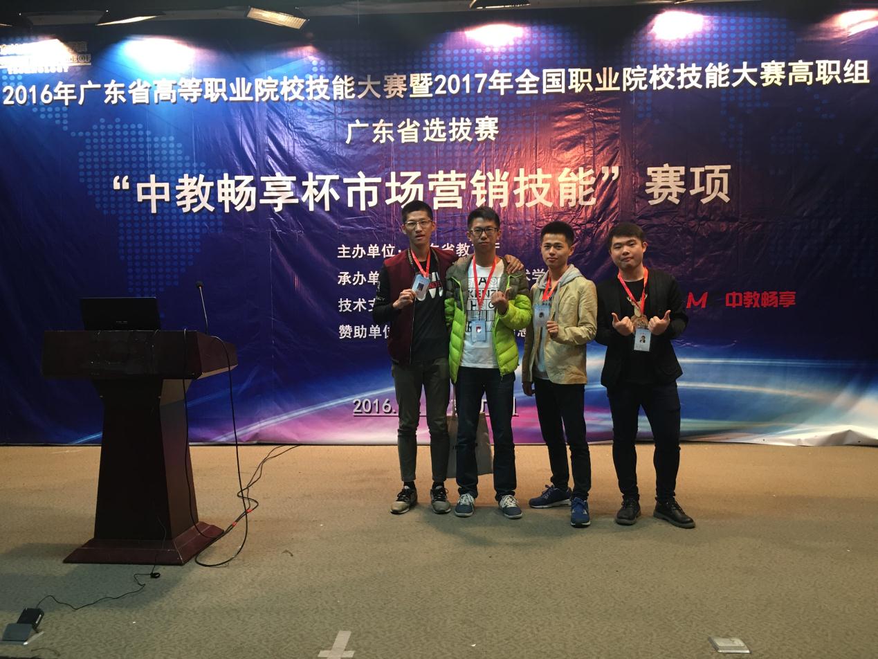 2016年12月4日,2016年全国职业院校技能大赛高职组市场营销技能赛项广东省选拔赛在广东岭南职业技术学院广州校区举行,来自全省的66支参赛队伍分在6个组别进行角逐。信息工程与商务管理学院市场营销专业在学院领导的关心和督导下派出了由市场营销专业负责人涂志军老师带队,张信阳老师和彭韬老师作为指导老师的参赛队伍,队员包括有李立兴、周培锋、黄志锋、蔡少培、张俊华等五人。经过全天6小时全封闭的技能实际操作比赛及商务素养问答环节,最终获得了三等奖。