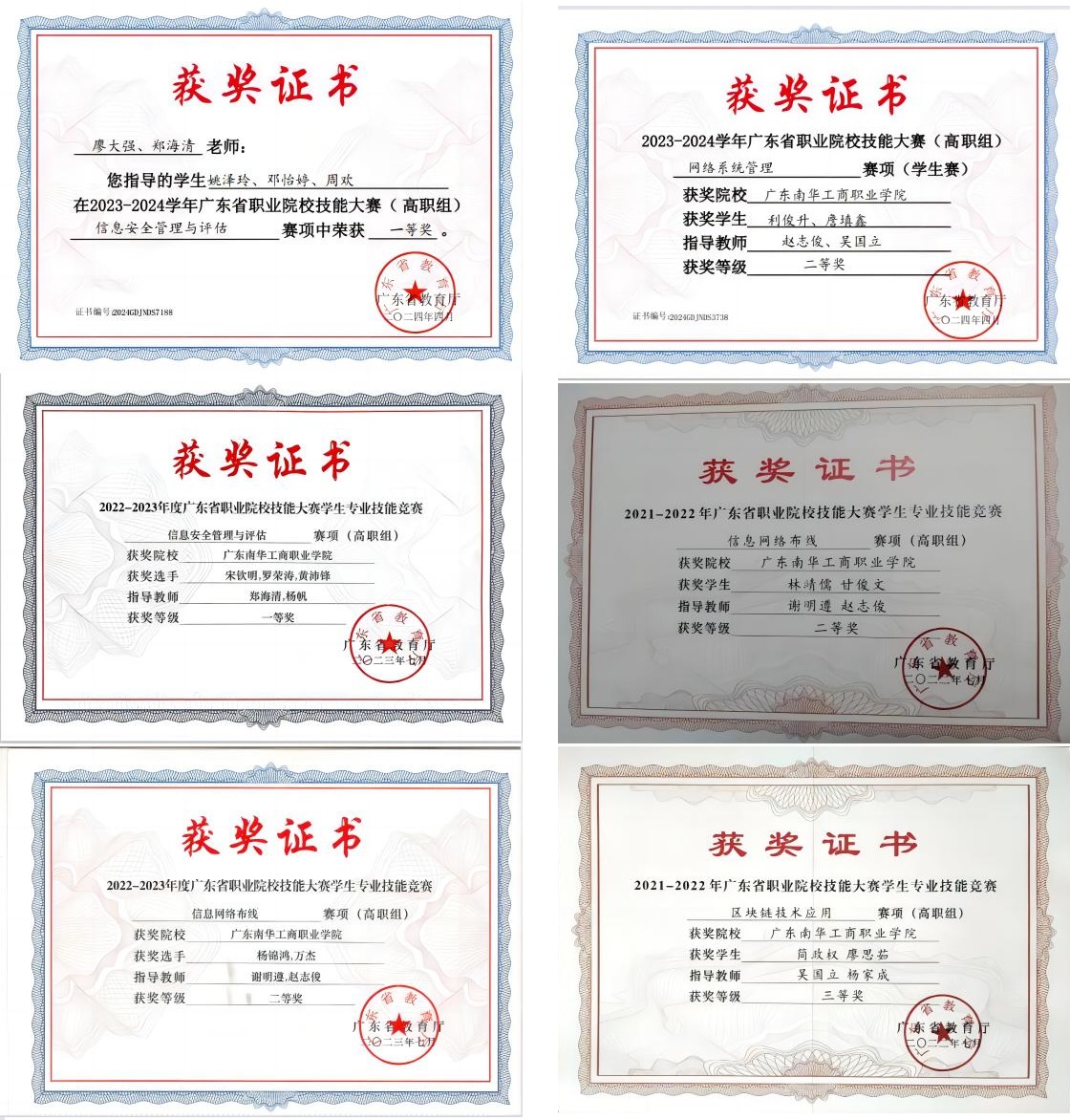 在省职业技能竞赛中,网络系统管理赛项二等奖2项、三等奖3项,信息网络布线二等3项,信息安全管理与评估一等奖2项、二等奖2项、三等奖3项;