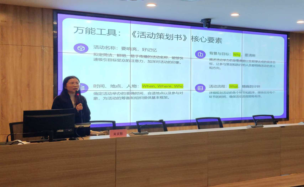 11月20日,建筑装饰学院“青年马克思主义者培养工程”培训班(以下简称“青马班”)第四讲于图书馆报告厅开讲。本次讲座由吴笑影老师主讲,以“一场好的活动策划组织及总结”为主题,为学生干部开展团学活动及班级素质拓展活动提供案例参考与实践指导。吴笑影老师讲授“青马班”第四讲讲座中,吴笑影老师结合团学及班级素质拓展活动案例,从“调研需求”“策划要点”“执行技巧”“总结复盘”四维度,讲解优质活动全流程。她提...