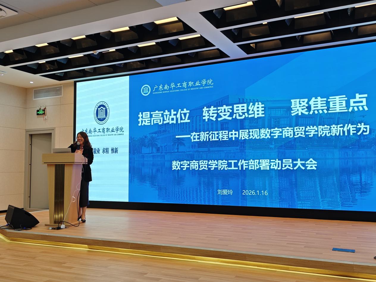 1月16日,数字商贸学院在第二实训楼204召开2025年度全院工作总结暨新学期部署动员大会。会议围绕“提高站位,转变思维,聚焦重点,在新征程中展现学院新作为”主题,对2025年的工作进行了总结,共谋新一年学院改革发展大计。学院党总支书记刘爱玲为大家做了工作部署动员,从提高政治站位,融入大局,在爱校荣院中凝聚共识、激发动力;转变思维,在开拓创新、塑造品牌中提升格局;聚焦重点,深化改革,在实干担当中攻坚克难,激...
