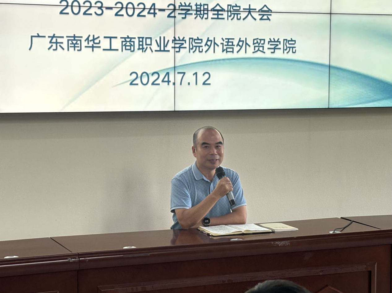 7月12日,外语外贸学院(下称“外院”)在清远校区教学楼101召开2023-2024-2学期全院大会。 图1 会议现场 外院党总支部副书记刘爱玲回顾上半年工作成效,并明确下半年发展重点。她提出,在党建方面要加强数字党建建...