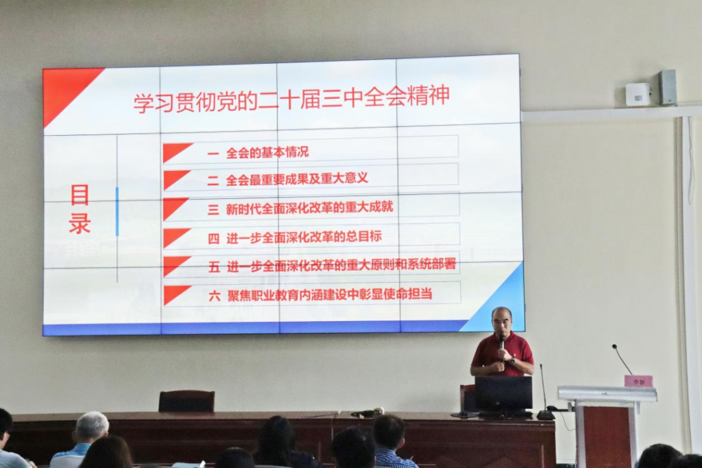 9月29日下午,学校党委委员、外语外贸学院(以下简称“外院”)院长李新开展党的二十届三中全会精神宣讲活动。李新对党的二十届三中全会精神进行了全面而系统的阐述,涵盖了其基本情况、重要成果、深远意义以及新时代全面深化改革所取得的重大成就等多个维度。他要求,全体师生应持续深入学习并贯彻党的二十届三中全会精神,内化于心、外化于行,积极投身于推动学校高质量发展的实际行动之中,为实现既定目标贡献力量。 图1 李...
