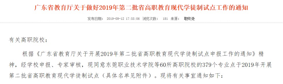 9月12日,广东省教育厅公布《关于做好2019年第二批省高职教育现代学徒制试点工作的通知》,我校共有17个项目获准试点(其中文旅学院12项、建艺学院3项、法公学院2项),位居全省立项数第三名,仅次于广东建设职业技术...