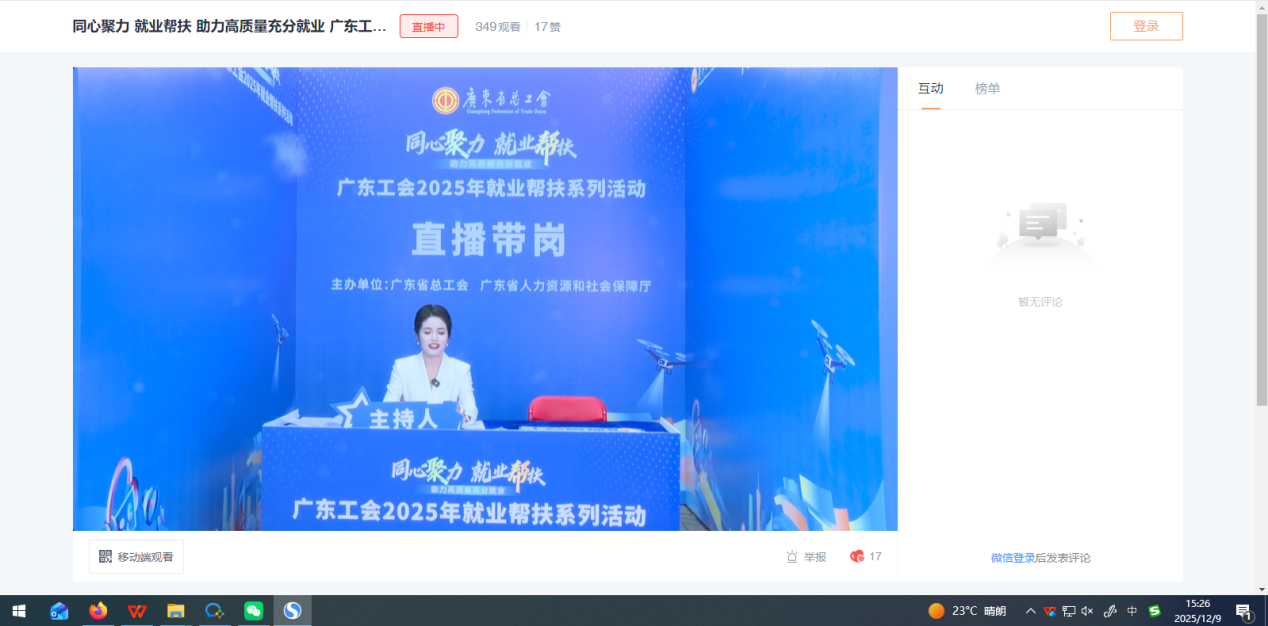 2025 年 12 月 9 日,广东南华工商职业学院清远校区成功举办 “同心得聚力 就业帮扶 助力高质量充分就业 —— 广东工会 2025 年就业帮扶系列活动”。活动期间,学校教育技术与信息中心凭借专业技术支撑与高效响应能力,为活动直播环节提供了稳定可靠的网络保障,助力就业帮扶工作精准落地。