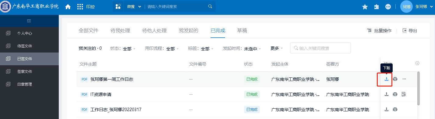 OA——印控——已签文件——点击对应文件的下载按钮。