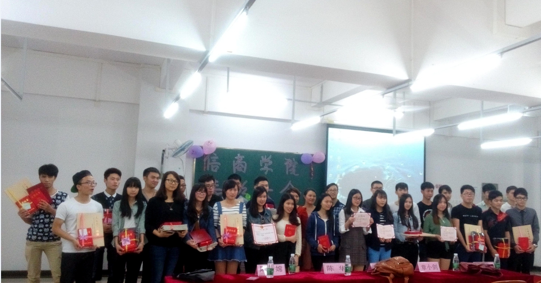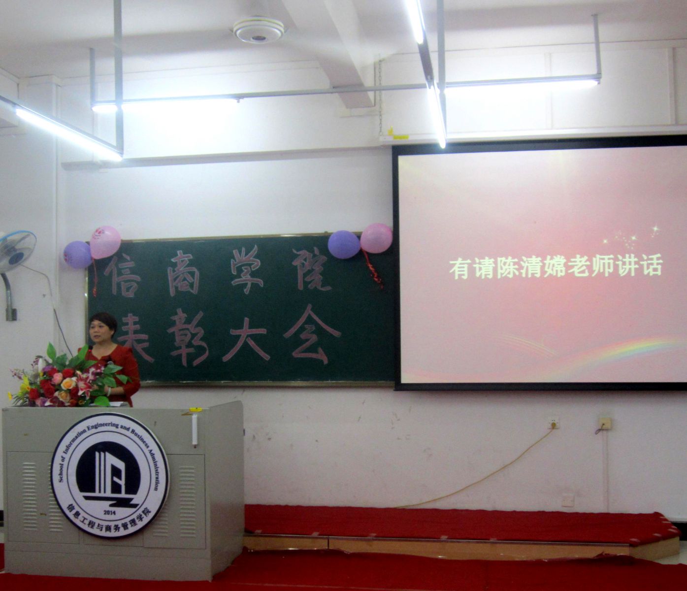 2015年4月21日晚上18:40,信息工程与商务管理学院(以下简称信商学院)在清远校区实验楼316举办了2013-2014学年表彰大会,出席此次大会的有辅导员陈清嫦、陈华、章小剑、袁小梅及崔宁这五位老师。信商学院13级14级各班班长及学生代表均参加了此次大会。 本次大会由14级连锁与经营管理班的学生主持。他简短地介绍本次表彰大会情况与内容,并一一介绍本次出席嘉宾。紧接着是陈清嫦老师作为代表上台讲话,她首先对本次表彰大会获奖者表示衷心的祝福,其次希望获奖者能够再接再厉,同时也希望我们信商学院的同学们能够共同努力,带着这种优秀品质代表信商,代表南华走出校门,为学院争光!场上的信商学院的学子们备受鼓舞,将热烈的掌声送给陈清嫦老师。 接下来是表彰环节,由主持人宣读”优秀先进班级”、“三好学生标兵”、“三好学生”以及“优秀学生干部”名单。随后,出席的辅导员们分别为表彰集体与个人颁发了获奖证书与奖品。无论是集体还是个人,他们都是信商学院的骄傲,他们用各方面的成绩证明了他们的实力。我们相信今后的他们也一定会再接再厉,再获佳绩。 最后由主持人对本次大会做出简单总结,相信信商学院在全院师生的齐心协力下,一定会更加强大!本次表彰大会终于圆满落幕。我们向每一位获奖的同学喝彩,也祝福我院在以后会更加强大辉煌!