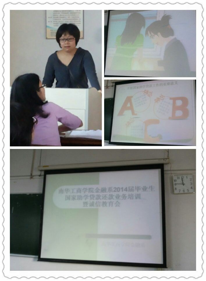 自今年起,学院学生资助管理中心把毕业生助学贷款的贷后管理工作下放到各系,为了响应教育部全国学生资助管理中心《关于做好国家助学贷款贷后管理工作的通知》及学院学生资助管理中心的相关要求,金融系于2014年5月10日下午4点在天河校区教学楼702开展了2014届助学贷款毕业生诚信教育活动。活动由毕业生奖助贷助理杨扬担任主持,学生处主管胡娟老师、金融系党总支副书记赵玲霞老师、14届毕业生辅导员袁小梅老师、甘雪花老师及高校贷款和生源地贷款的应届毕业生参加本次活动。