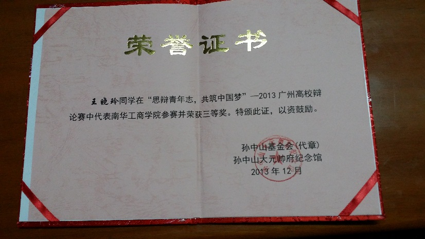 经过3个月准备,一个月角逐,广州市2013年思辨青年大赛12月底落下帷幕,法律系2011级法律事务班王晓玲、方展翔、刘得意、陈翠萍四位同学获广州市大学生辩论赛3等奖。