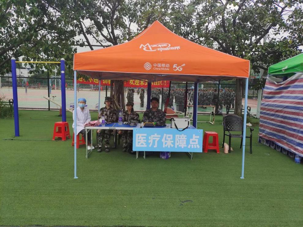 军训期间,在现场设置了医疗保障点,安排医护人员现场值守,提前准备了葡萄糖、热水、各种常用的药品以及外伤药,还准备了轮椅、氧气袋以及 AED,以防突发状况发生时学生能第一时间得到救治,全力保障医疗安全。