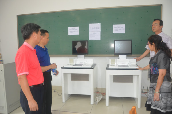 座谈会后,我院人员到青职院教师公寓、教学楼、图书馆、网络中心实地参观,在教师公寓,大家细致观察了大楼设计与室内设置;在图书馆,众人的目光纷纷被两台新式的自助借书机所吸引,并认真了解了该机器的功能与使用方法。