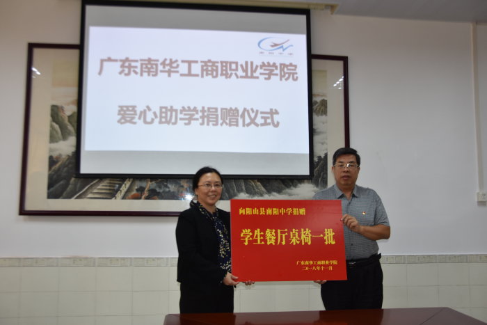 为深入学习贯彻落实党的十九大精神及习近平总书记系列重要讲话精神,11月7日,学校副校长唐晓林带领总务处处长谢启文、党支部书记王宇花及支部党员一行6人到清远市阳山县南阳中学开展爱心助学捐赠暨党支部主题党日活动。我校为南阳中学捐赠72套(536位)学生餐桌椅。阳山县教育局教育股股长伍进强、南阳中学党支部书记、副校长王业瑾参加了捐赠仪式。