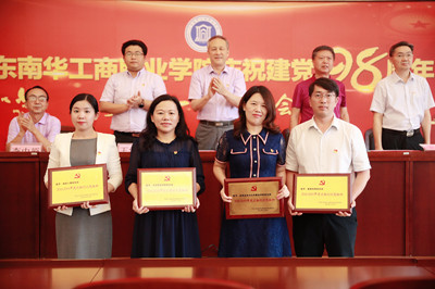 与会领导先后为获得表彰的党(总)组织、“五星”党员和优秀党务工作者颁奖。应用法学与公共事业学院副院长、专职组织员刘爱玲,清远综合办教工邱敏坚,外语外贸学院党总支组织委员郁春风,分别代表“达标创优”党组织、“五星”党员和优秀党务工作者发言,分享党建工作品牌经验,表达在平凡中见赤诚,继续继承和发扬实干精神,紧跟时代步伐,在平凡的工作岗位上做一名“闪光”的普通党员的决心和对党务工作无怨无悔的信念。