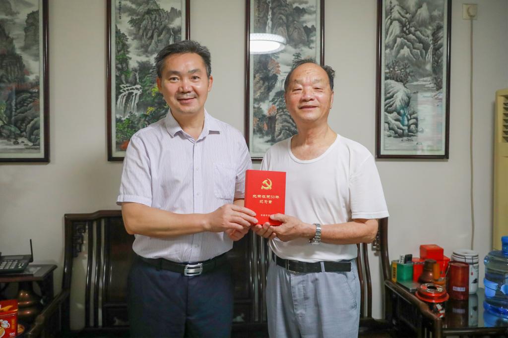 在中国共产党成立100周年之际,我校为6名党龄达到50周年以上的老党员同志颁发“光荣在党五十年”纪念章。
