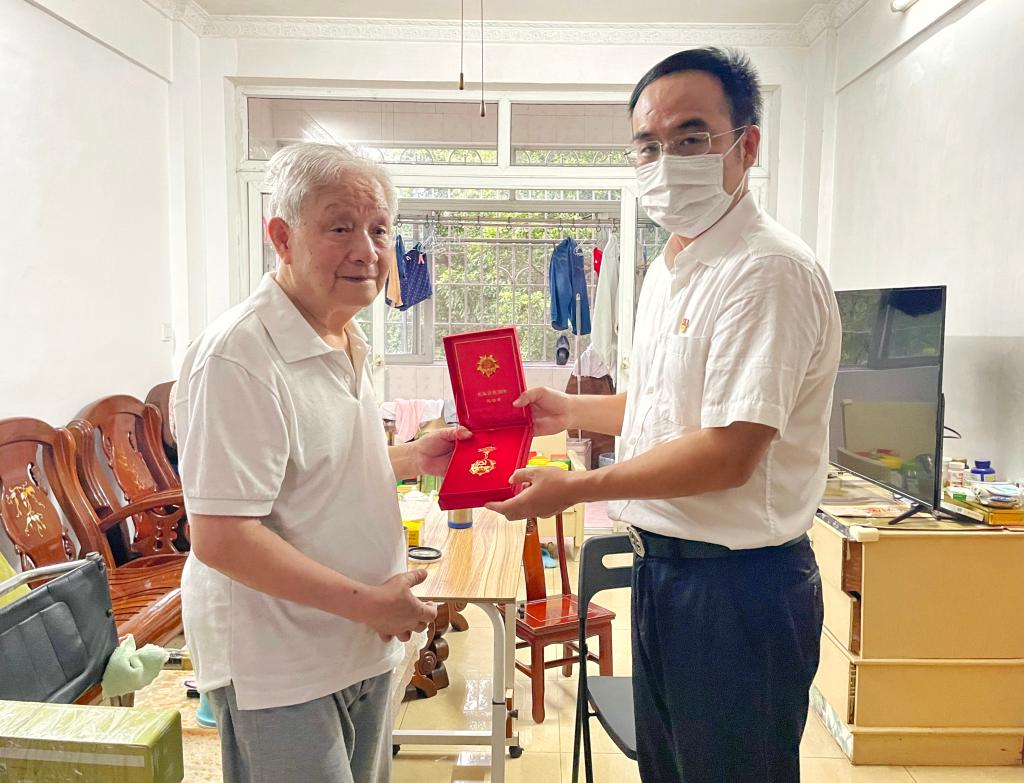 “光荣在党50年”纪念章是党中央2021年首次颁发的纪念章,颁发对象是党龄达到50周年、一贯表现良好的党员。我校共有6名党员获颁“光荣在党50年”纪念章,平均年龄85岁,其中党龄最长的达65年,年龄最大的党员94岁。结合学校工作实际,学校党委指派专人将“光荣在党五十年”纪念章送达至方权、李统列、林箕通、郑素虹4名同志。